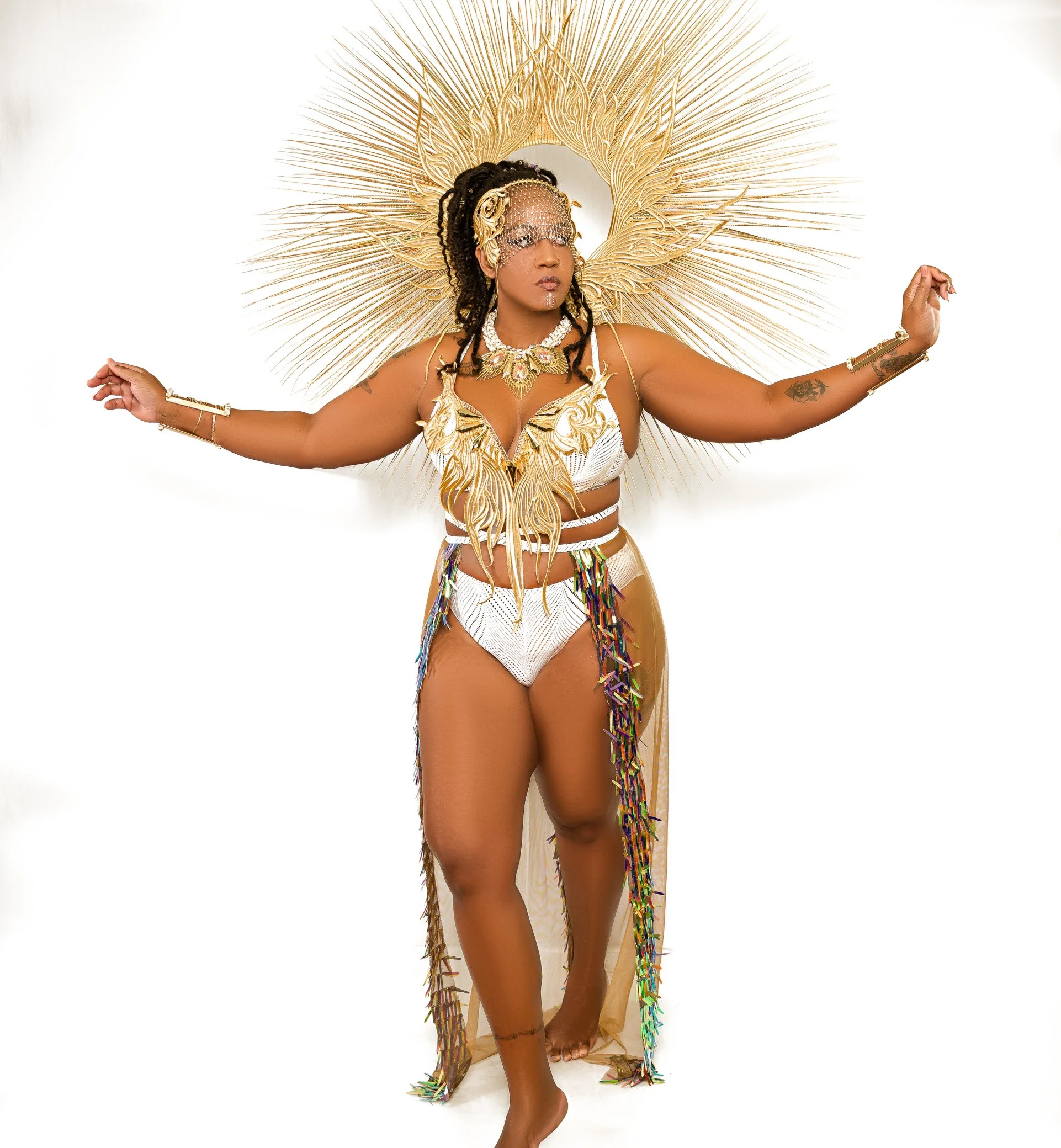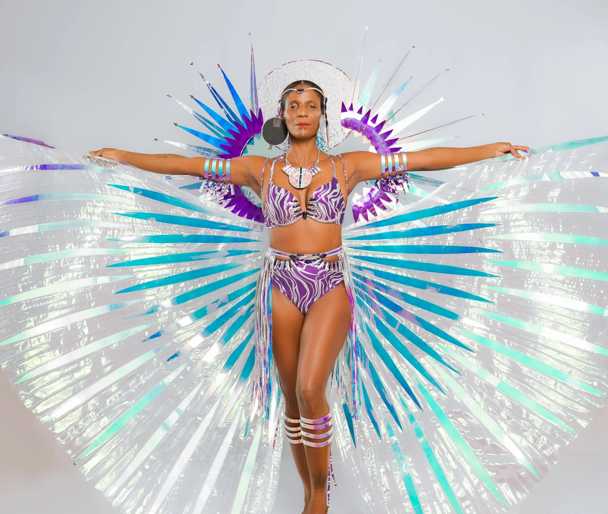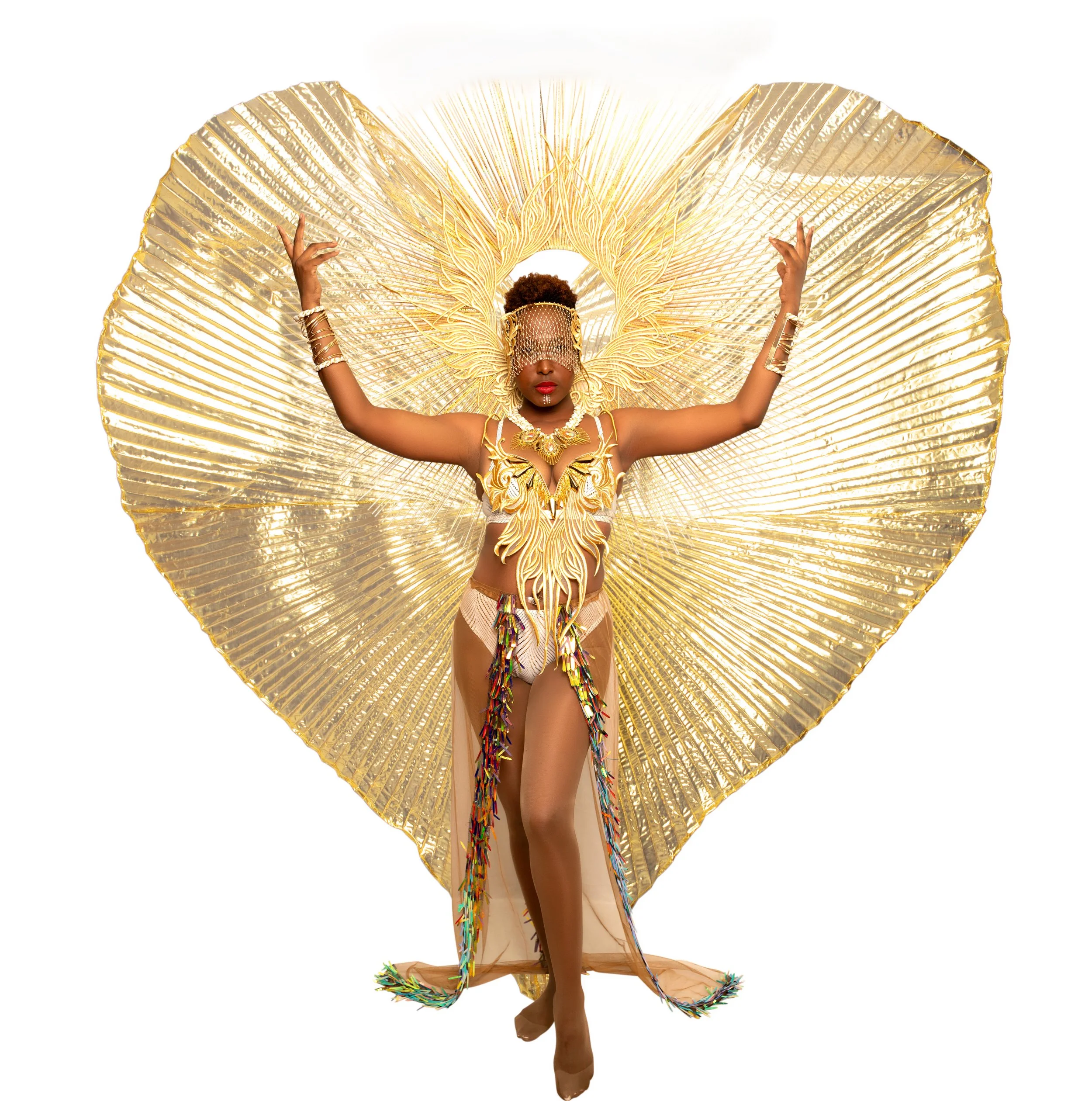 Yinka Rae, a section enveloped in the luminous beauty of iridescent hues, pays homage to its namesake meaning ‘surrounded by the light.’ The costumes shimmer with an array of vibrant colours that shift and change with every movement, symbolising the dynamic and ever-evolving journey of enlightenment. The iridescence captures the essence of inspiration and vision, reflecting the guiding light which Yinka Rae represents. This section embodies the radiant energy that lights the way, celebrating the spirit of those who have illuminated the path for generations.